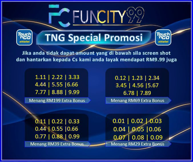 Funcity99 will be giving away Welcome Bonus Dep MYR30 get MYR50 / Dep MYR50 get MYR90 / Dep MYR100 get MYR200 first time deposit of new registered member on our website with minimum deposit MYR30.